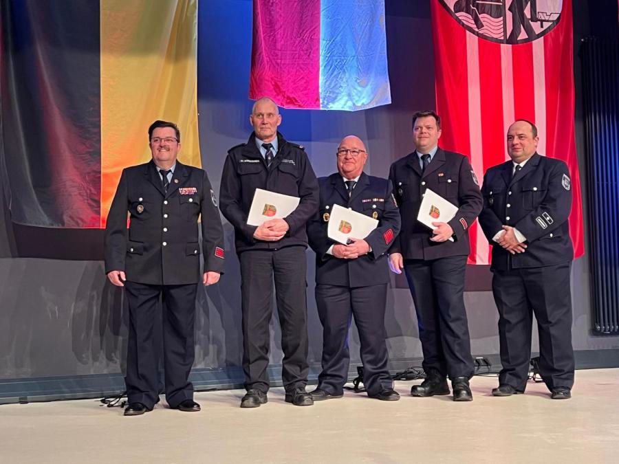 Anlässlich des Ehrenamtsabend der VG Bodenheim am 08.03.2024 in Gau-Bischofsheim wurde durch den 1. Vorsitzenden drei verdiente Kameraden, Herr Hoffmann, Herr Hamm Zang und Herr Fritzsch mit dem silbernen Ehrenzeichen vom Landesfeuerwehrverband Rheinland-Pfalz ausgezeichnet.
